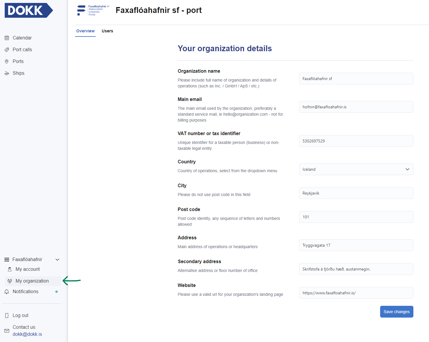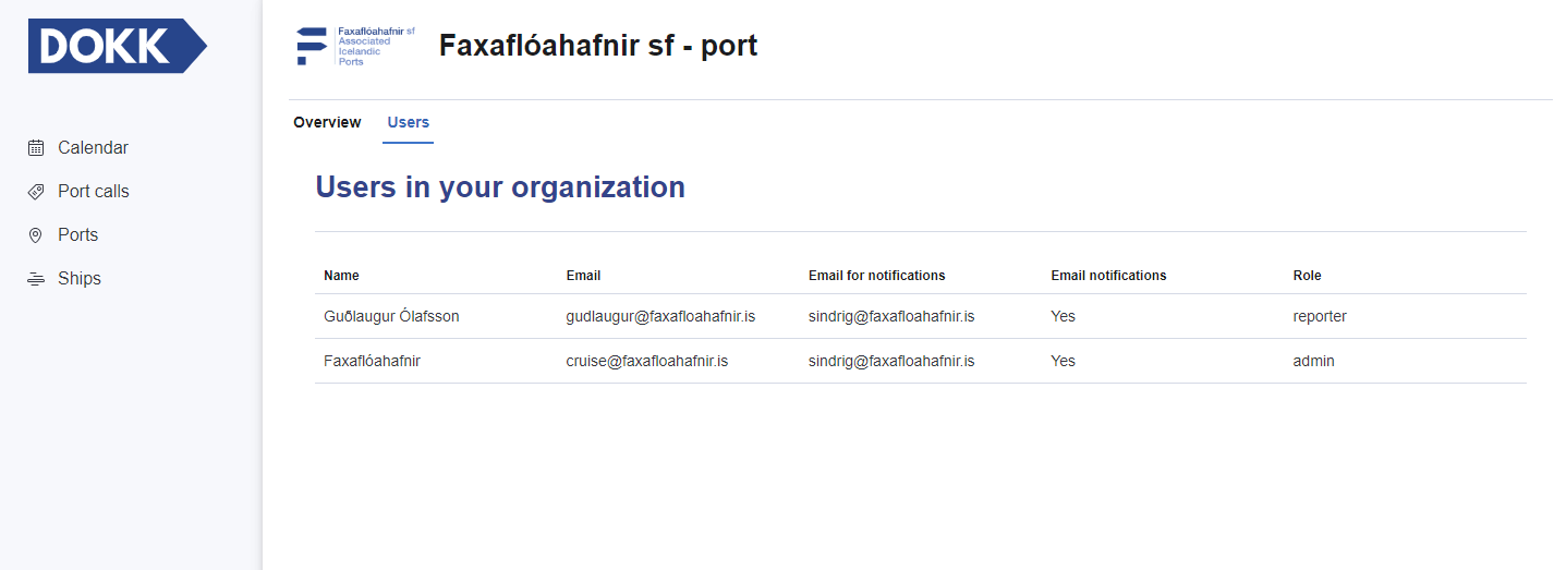 Admin users are capable of editing all information regarding their organization and ports as well as all port calls made to it. You can visit portal.dokk.is/organization to view your organization once it has been set up.