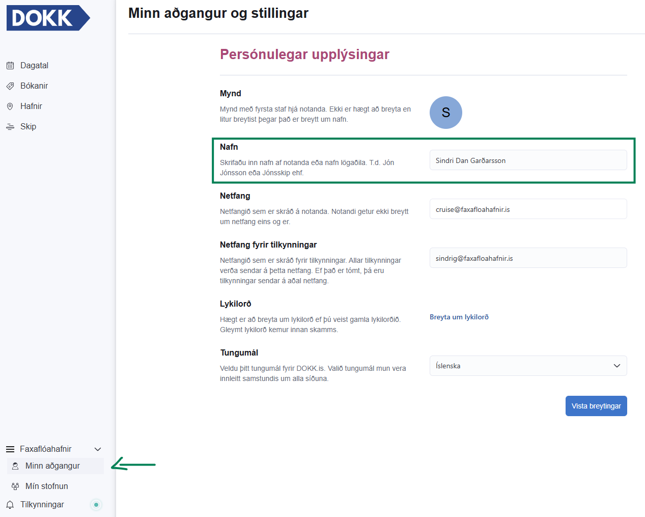 Til að byrja með munu öll félög fá úthlutað einn aðalaðgang án endurgjalds (e. admin account). Ykkar núverandi aðgangar munu þá flokkast sem aðalaðgangar fyrir ykkar félög, en hægt að breyta því ef óskað er eftir því. Við mælum jafnframt með því að breyta nafni á aðgöngum ykkar. Venjan var að nefna aðganga eftir höfn eða umboðsaðila en nú getur hver notandi fengið sinn aðgang. Dæmi um þetta er aðgangur Faxaflóahafna, [email protected] og var nafn aðgangsins Faxaflóahafnir. Nú mun notandi aðgangsins nota nafn sitt í stað nafn hafnarinnar: