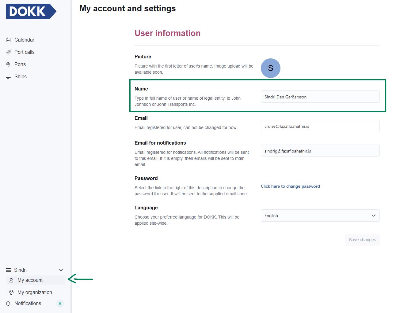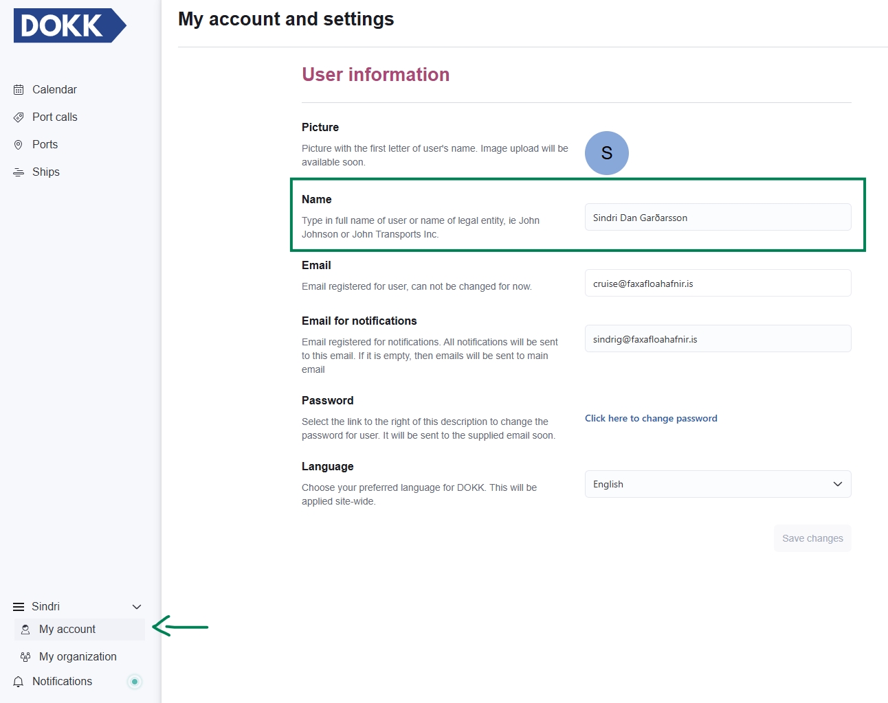 First, all organizations will include one main account at no charge. This account will be considered the main account (admin). We recommend changing your account name so it displays the full name of the actual user instead of the Port or Agency, as was the custom before. An example of this is the main account of Faxaflóahafnir, which will now display the name of the actual user who operates [email protected]: